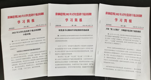 在严格落实校园疫情防控的要求下,培训班采取“线上+线下”的方式开展了高质量、强互动、有温度的党员教育培训。10月3日—9日,培训班云课堂依托国家教育行政学院的中国教育干部网络学院平台组织实施,参训学员在线上听取了政治理论教育、党史教育、党章党规党纪和疫情防控等专题讲座,各小组在“云课堂”的基础上,自行组织开展了别开生面的“云讨论”“云宣誓”等系列活动,让大学生党员骨干进一步加强了政治理论学习、提升了党性修养。